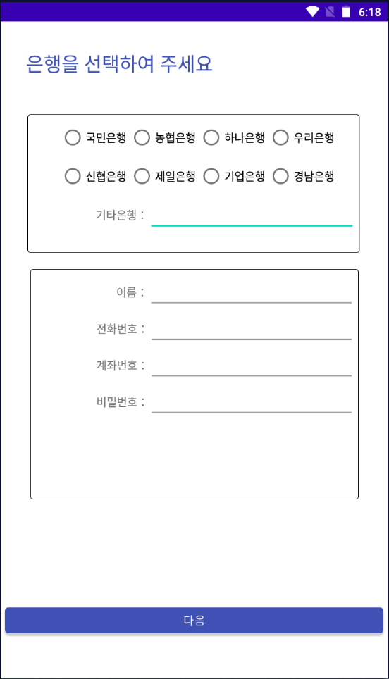 <악성 앱 설치 시 개인정보 및 금융 정보 입력 유도 화면 >