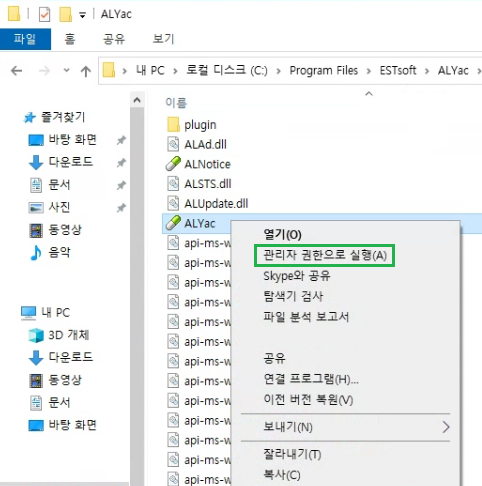 또는 알약 설치 폴더에서 C:\Program Files\ESTsoft\ALYac\ALYac.exe 파일을 찾아 마우스 우측 클릭 - 관리자 권한으로 실행(A) 해주면 됩니다.