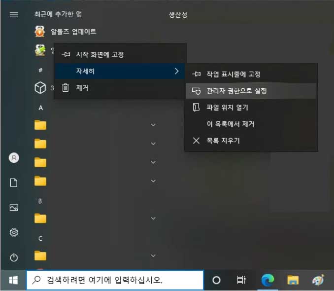 해결 방법 : 윈도우 키 클릭 - 알약 프로그램 마우스 우측 클릭 - 자세히 - 관리자 권한으로 실행