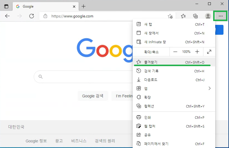 엣지 실행 - 삼선 클릭 - 즐겨찾기 선택해주세요.
