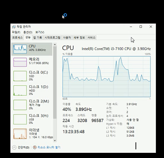 작업 관리자의 성능을 확인해보니 CPU 사용량이 들쭉날쭉하네요. 컴퓨터를 켠 후에 직접 실행한 프로그램이 없는데도 CPU 사용량이 높다는 것입니다.