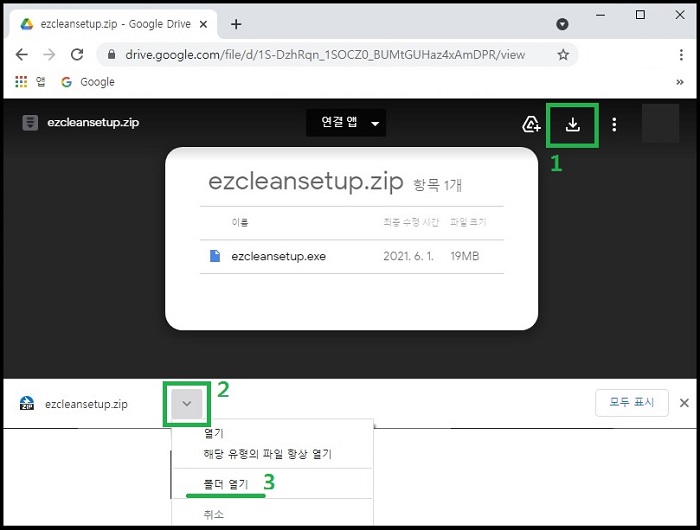 이지클린(EzClean) 다운받기를 클릭하면 구글 드라이브로 연결이 됩니다.