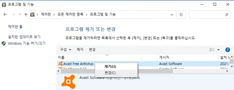 '제어판 - 프로그램 및 기능' 목록에서 Avast Free Antivirus를 찾아서 마우스 우측 클릭 후 제거를 해주세요.