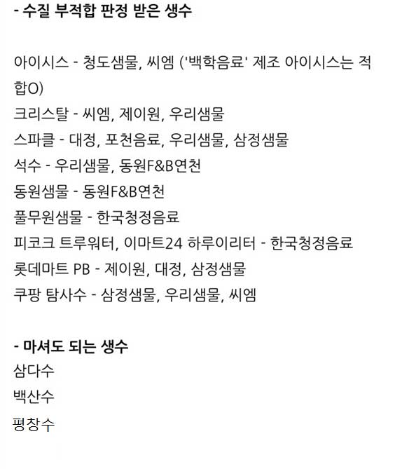 수질 적합 생수가 달랑 '삼다수, 백산수, 평창수' 3개 밖에 없다니 앞으로 더 조심하면서 살아야겠어요.