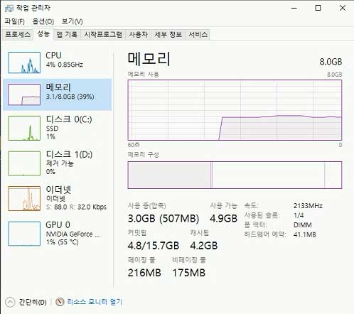 컴퓨터를 재부팅하고 작업 관리자를 열어서 성능을 확인해 보니 CPU와 메모리 사용량이 줄여들었습니다.