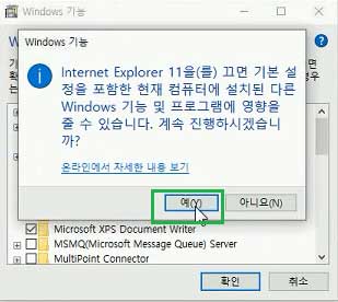 Internet Explorer 11을 끄면 기본 설정을 포함한 현재 컴퓨터에 설치된 다른 Windows 기능 및 프로그램에 영향을 줄 수 있습니다. 계속 진행하시겠습니까? 예 클릭