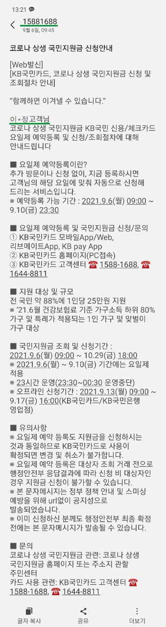 <국민카드 고객센터에서 정상적으로 받은 국민지원금 신청 안내 문자입니다.>
