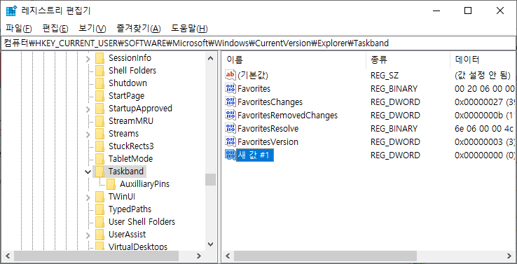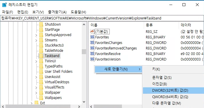 3. Taskband 키 오른쪽 빈공간에서 마우스 우측 클릭 - 새로 만들기 - DWORD(32비트) 값(D) 클릭