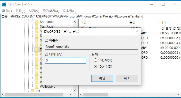 5. NumThumbnails을 떠블클릭 후 단위 : 10진수(D)를 선택하세요.