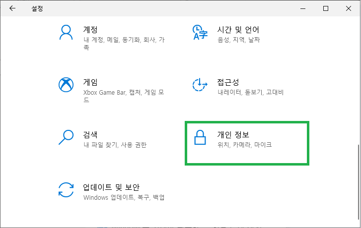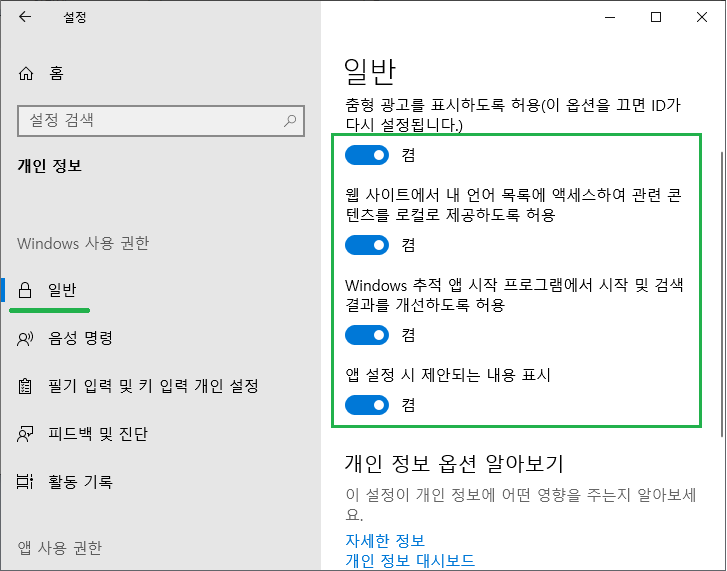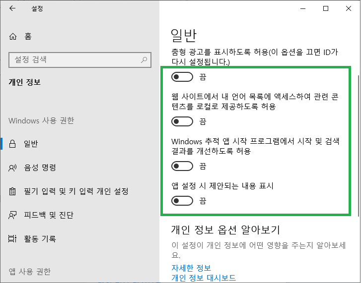 다시 뒤돌아가서 홈 화면에서 개인정보를 클릭해서 개인 정보 옵션 변경 아래의 모든 토글 4개를 켬에서 끔으로 변경해주세요.