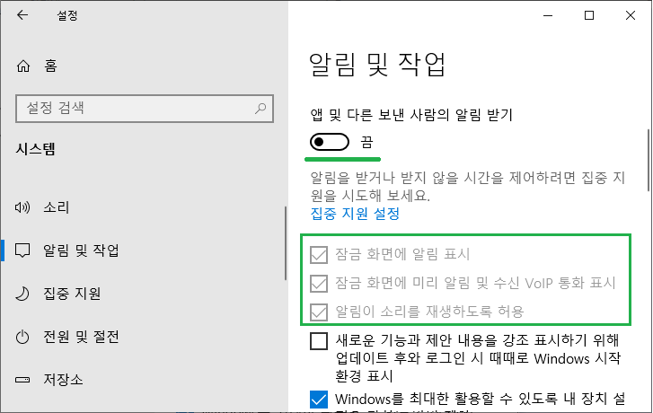 잠금 화면에 알림 표시, 잠금 화면에 미리 알림 및 수신 VOIP통화 표시, 알림이 소리를 재생하도록 허용 3개가 동시에 체크가 해제가 될 것입니다.