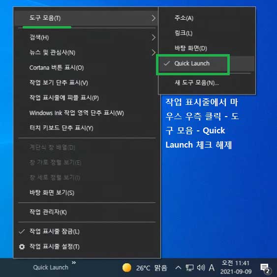 작업 표시줄의 빈 공간에서 마우스 우측 클릭 - 도구 모음(T) -Quick Launch를 체크 해제해주면 됩니다.