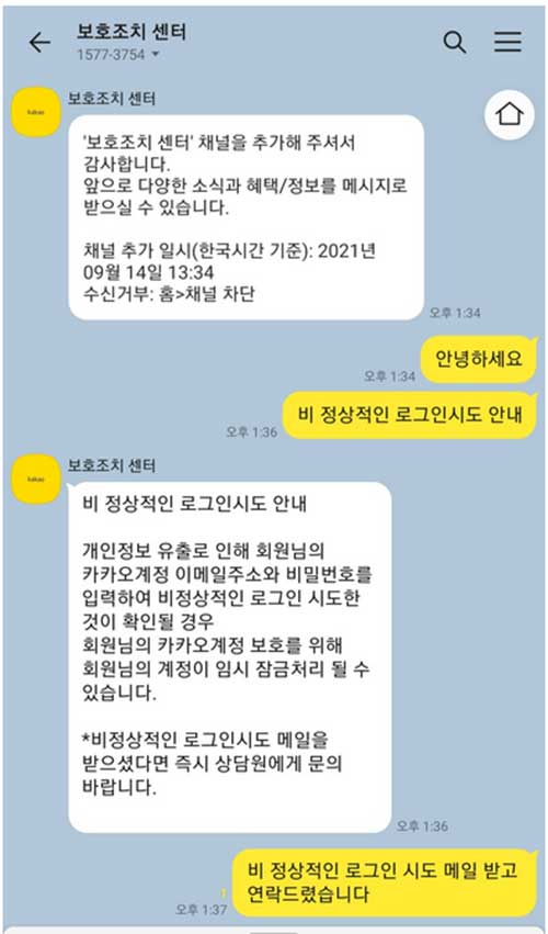 본인이 직접 로그인을 시도한게 아닌데 이 메일을 받았다면, 카카오톡 검색창에 "보호조치 센터" 검색하시고 상담원과 연결 후 즉시 상담요청을 해주시길 바랍니다.