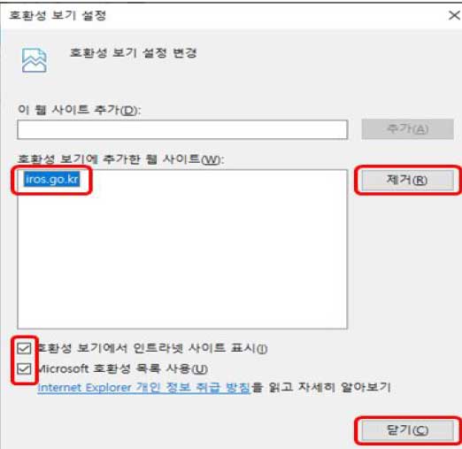 3. 호환성 보기 목록에 ‘iros.go.kr’을 제거하신 후 아래 체크박스를 모두