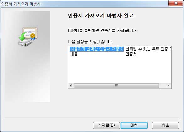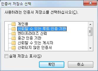 인증서 저장소 선택 : 신뢰할 수 있는 루트 인증 기관 선택 후 확인