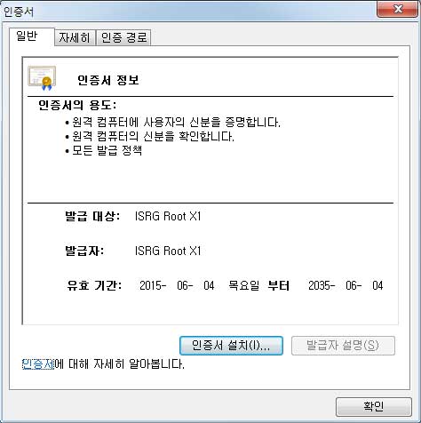 아래 isrgrootx1.der, isrg-root-x2.der, lets-encrypt-r3.der를 다운로드 후 더블클릭으로 실행하세요.