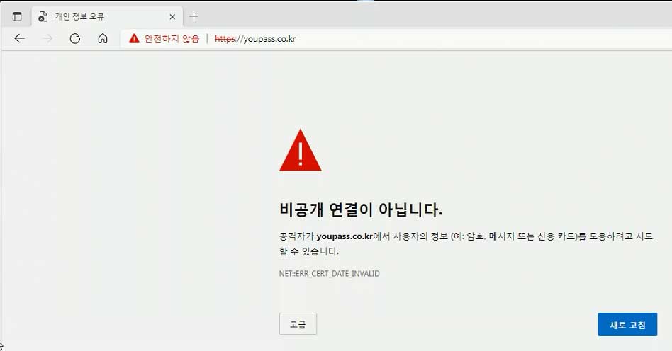 | 비공개 연결이 아닙니다. 공격자가 youpass.co.kr에서 사용자의 정보 (예: 암호, 메시지 또는 신용 카드)를 도용하려고 시도할 수 있습니다. |