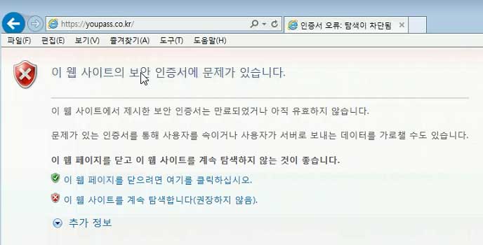 | 이 웹 사이트의 보안 인증서에 문제가 있습니다. 이 웹 사이트에서 제시한 보안 인증서는 만료되었거나 아직 유효하지 않습니다. 문제가 있는 인증서를 통해 사용자를 속이거나 사용자가 서버로 보내는 데이터를 가로챌 수도 있습니다. |