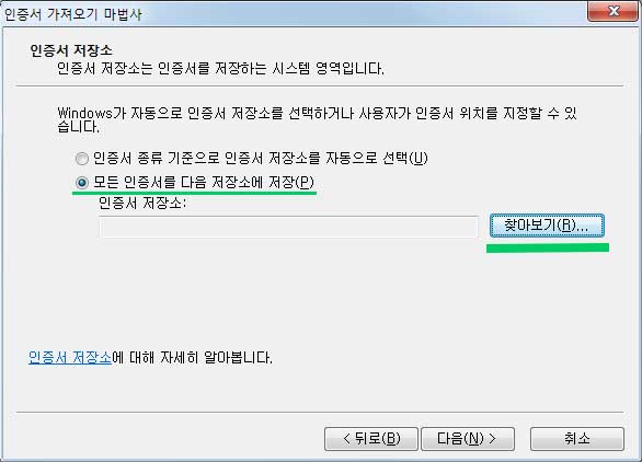 모든 인증서를 다음 저장소에 저장(P) - 찾아보기(R)를 클릭하세요.