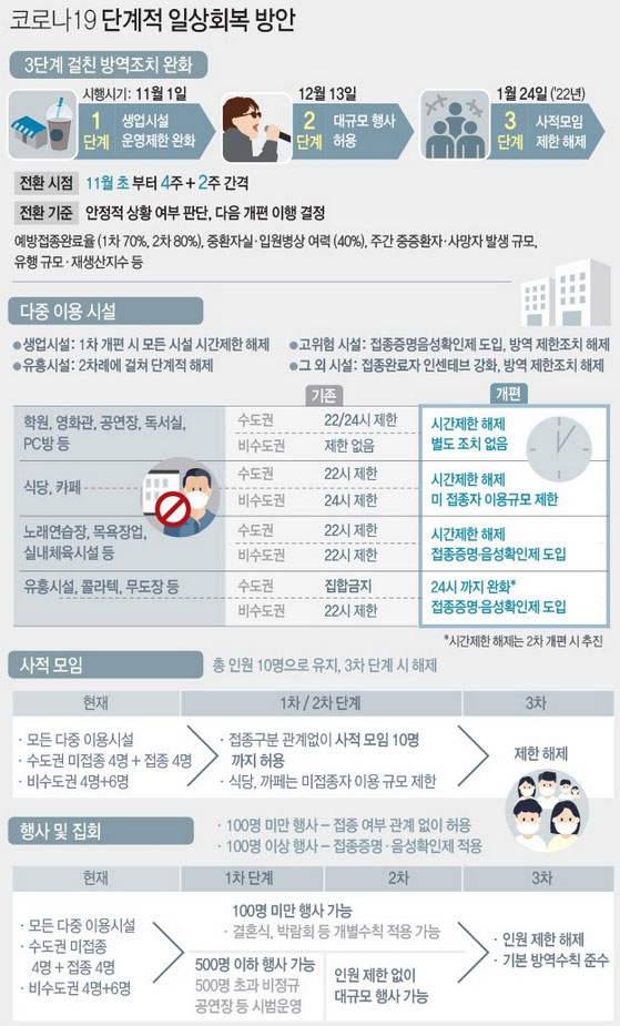 기념식, 행사등 : 접종 구분 없이 100명 미만까지는 모든 행사, 집회 가능. 접종완ㄹ자만으로 구성시 500명미만까지 가능