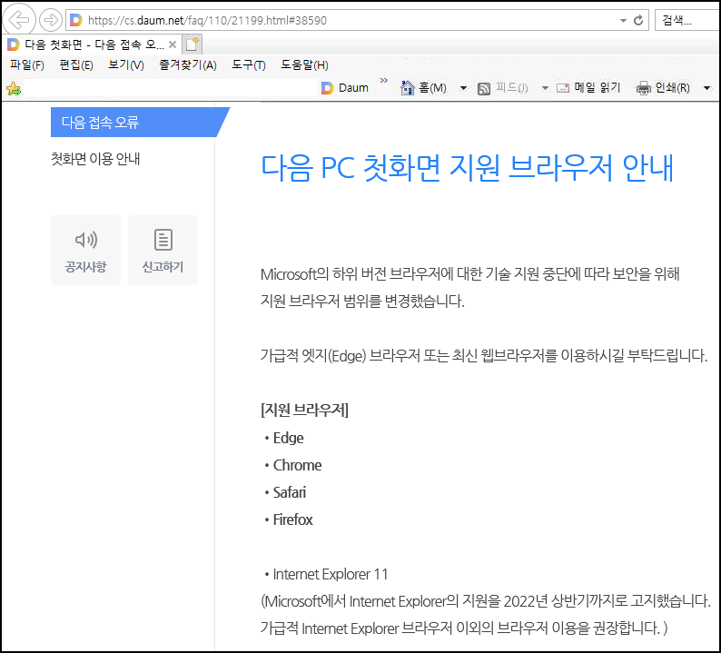 마이크로소프트사에서 인터넷익스플로러 11 기술지원을 중단한다는 소식은 오래전부터 나왔었죠. 최근에 구버전 인터넷익스플로러에서 다음 사이트 접속시 인증서 오류도 나오기도 했었습니다. 그래서인지 다음에서도 인터넷익스플로러 11을 손절하기 시작했습니다.