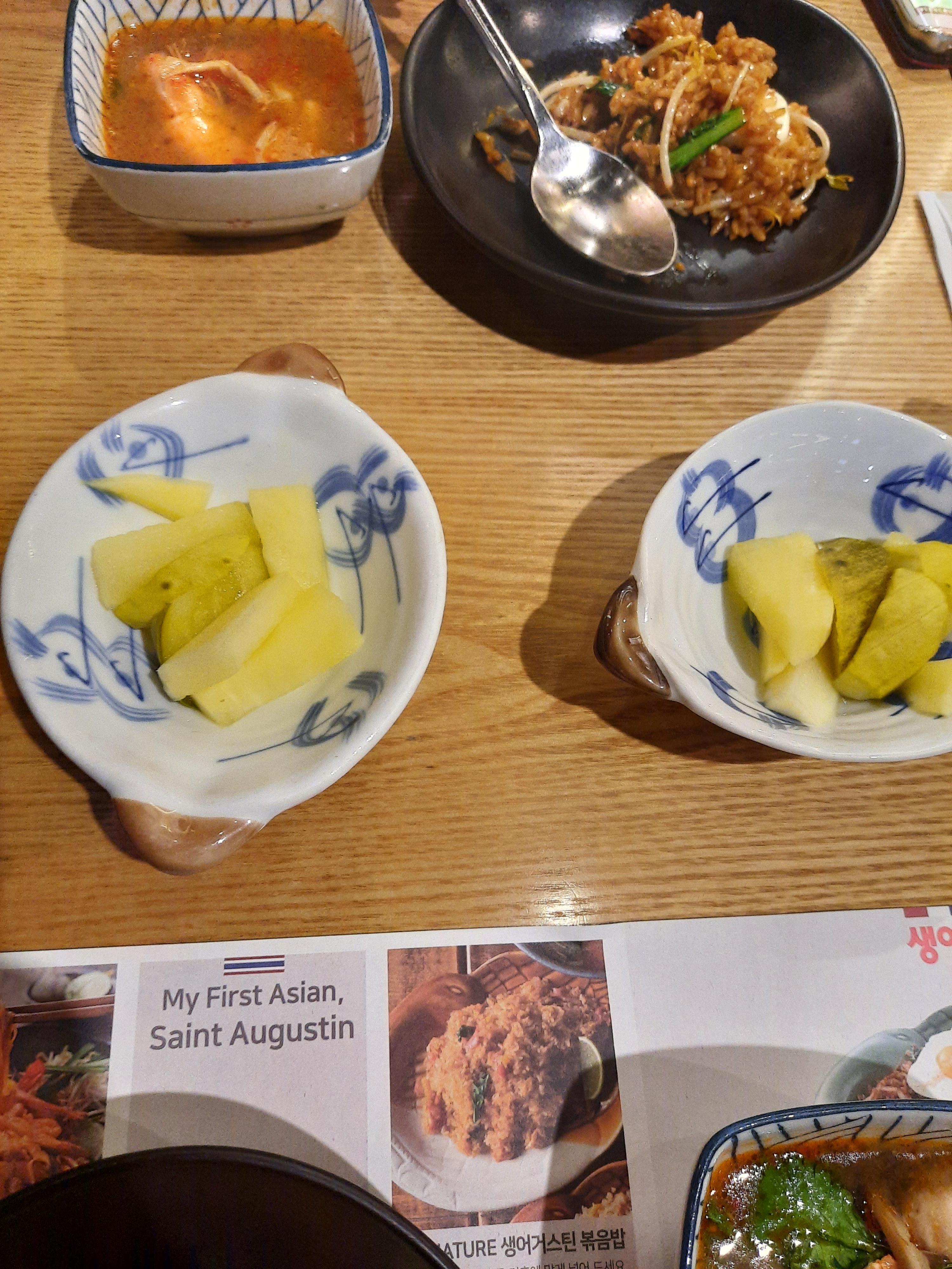 처음으로 나온 똠양꿍, 음... 이게 뭐지? 너무 간이 약하네. 내 입맛이 이상한가 했다. 그래서 생어거스틴을 네이버에 검색해봤다. 내돈내산이든 광고 블로거든 생어거스틴 똥양꿍에 대한 포스팅은 없다. 메인 메뉴가 아니었다는 것이겠지. 오늘 생어거스틴의 똥양꿍 선택은 실패 한 걸로.