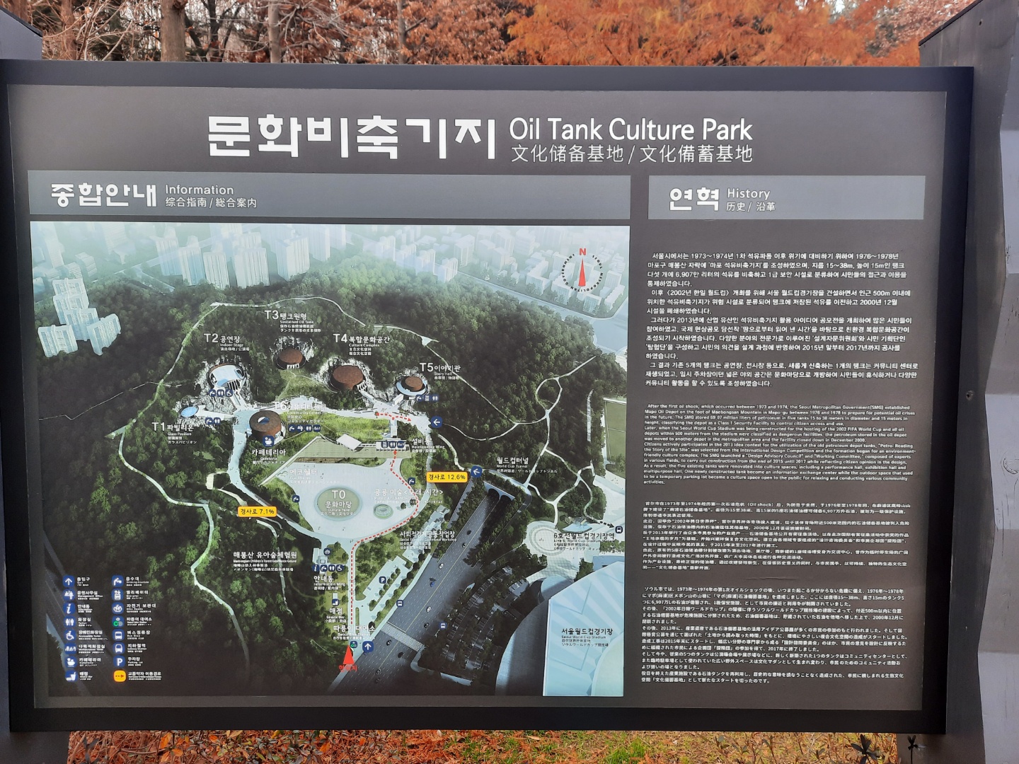 문화 비축 기지 정문에 위치한 종합 안내판입니다. 상암 월드컵 경기장 바로 옆에 위치하고 있지만 도로를 하나 건너야 하기 때문에 차가 다니는 월드컵 터널위 도로로 가지말고 안전하게 아래로 내려와서 신호등을 이용해서 건너세요.
