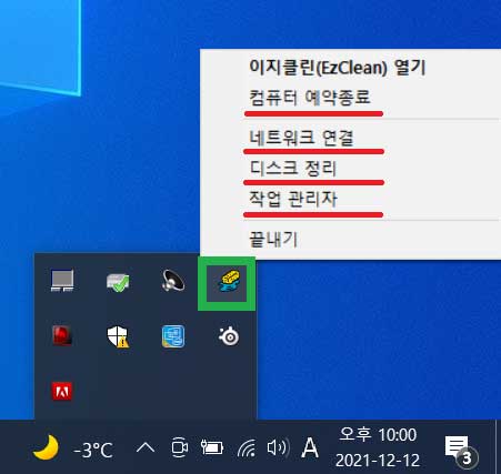 (1) 트레이 아이콘에서 마우스 우측 클릭하면 자주 사용하는 컴퓨터 기능인 '컴퓨터 예약종료, 네트워크 연결, 디스크 정리, 작업 관리자'를 한 번의 클릭으로 열 수 있습니다.