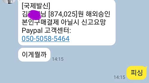 [국제발신] 김00님 [874,025]원 해외승인 본인 구매결제 아닐시 신고요망 Paypal 고객센터 : 052-5058-5464