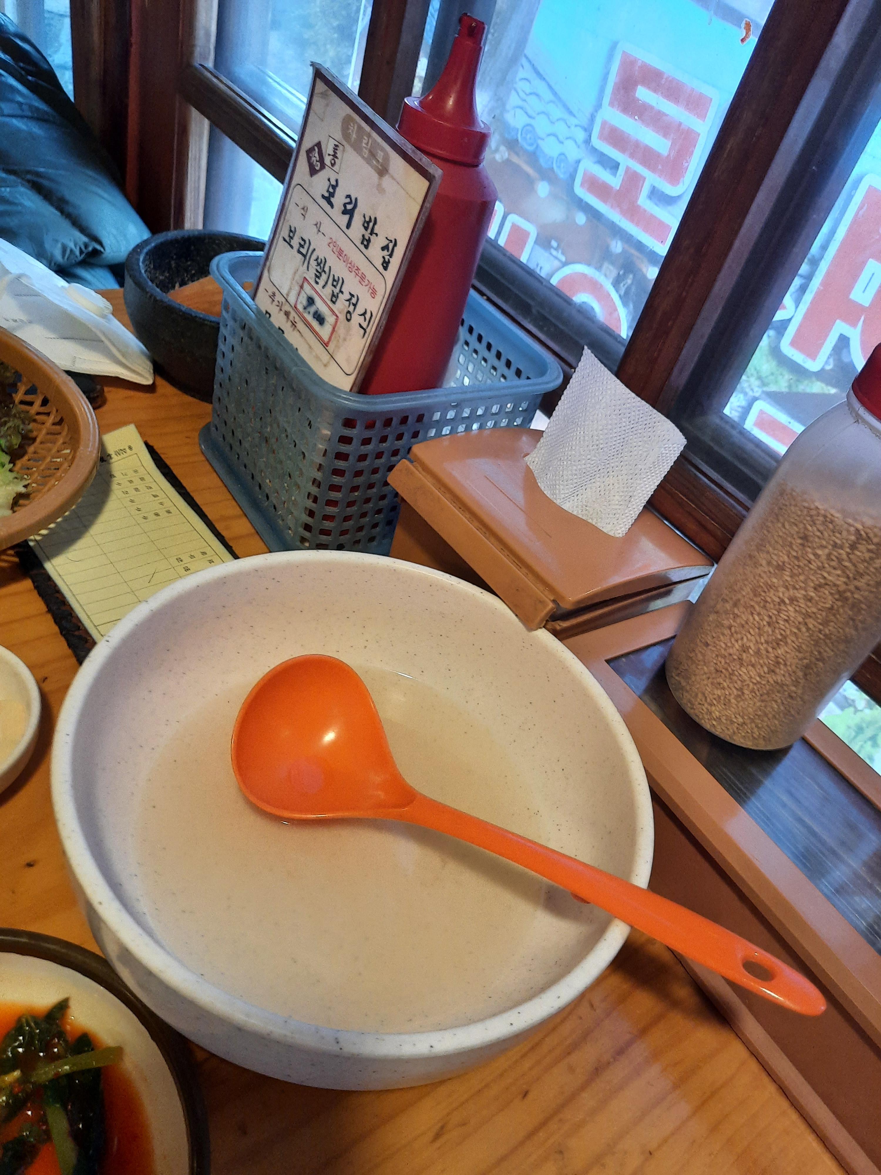 일반 물 대신 숭늉이 나옵니다. 진하지는 않지만 살짝 고소한 숭늉이네요. 통깨와 절구가 놓여져 있기에 우리가 직접 갈아서 비빔밥에 넣어서 먹을 수 있습니다. 별거 아닌 것 같지만 깨 가는 소리가 식욕을 돋우네요.