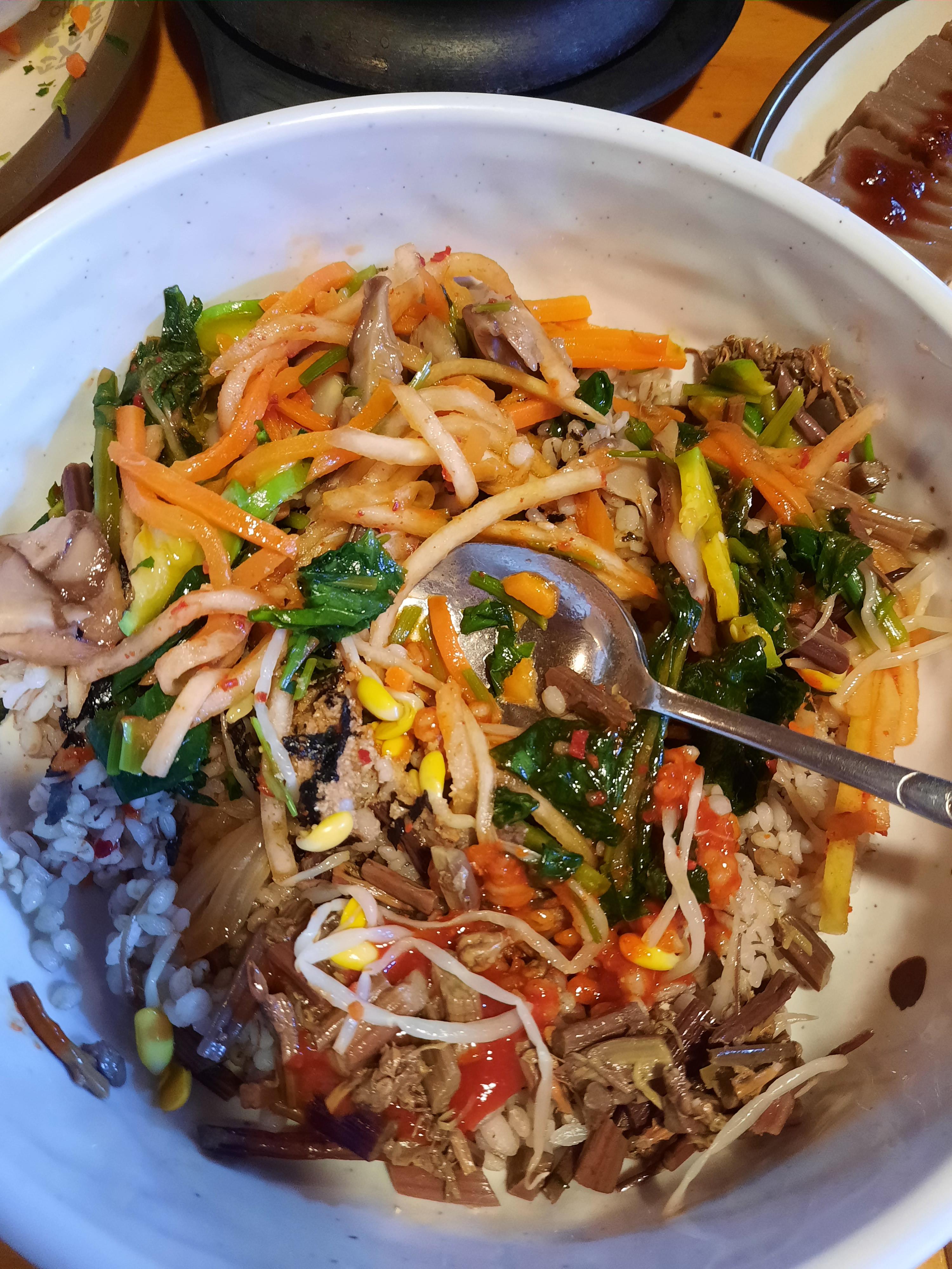 눈에 보이는 모든 나물과 채소들을 다 넣어줍니다. 기름과 내가 직접 빻은 깨도 넣었습니다. 사진을 못 찍는 내가 아무렇게나 찍어도 여러가지 색상으로 인해서 너무 맛있어 보이게 직혔네요. 물론 감탄하면서 먹었습니다. 식욕이 반찬인지 진짜로 맛있었는데 아니면 둘다~