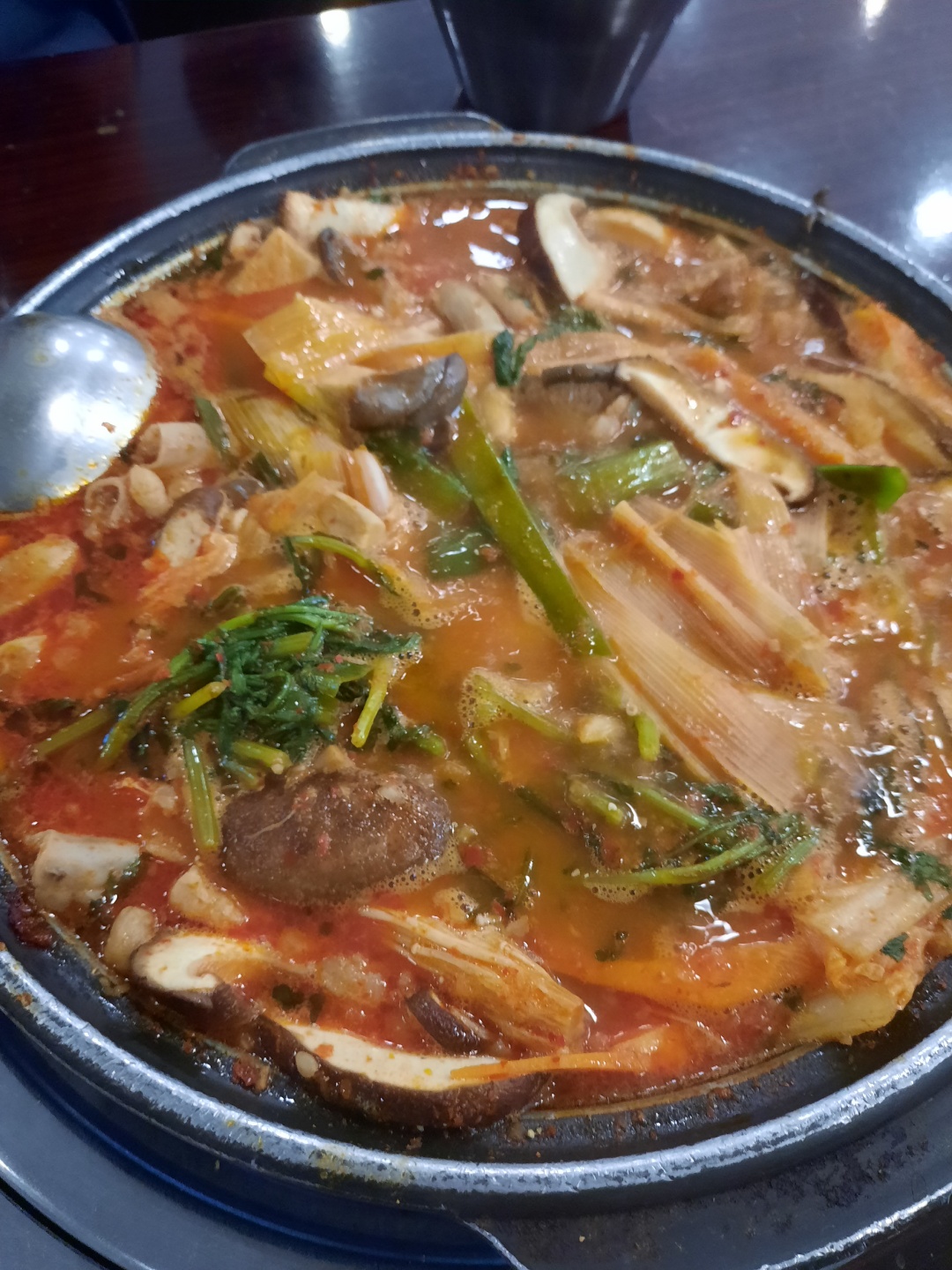 드디어 곱창전골이 다 끓었네요. 국물 한 숟가락 떠먹고 난 소주를 한 병 시켰다. 안 마실 수가 없었기에. 이 중앙해장의 곱창전골, 진심인데? 다른 식당과 맛이 다르다. 뭐라고 해야 하지? 단백하고 깔끔하고 진한 맛도 있고 텁텁하지 않다. 양념 때문인지 채소들의 싱싱해서인지 맛있다. 가격에 대한 비평이 싹 사라졌다고 할까나. 나 또 와서 먹을 것 같아.