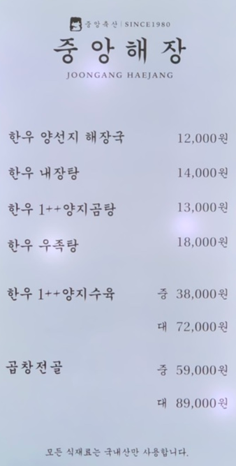 보통 양선지 해장국 7~8천원 내장탕 9천~1.2만원 곱창전골 1인 1.5만~1.7만 정도면 먹을 수 있는데 말이지.