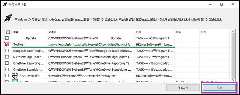 시작프로그램 목록을 볼 수 있는 프로그램을 실행하세요. 윈도우에는 msconfig가 있고 최적화 프로그램에도 거의 있는 기능입니다.