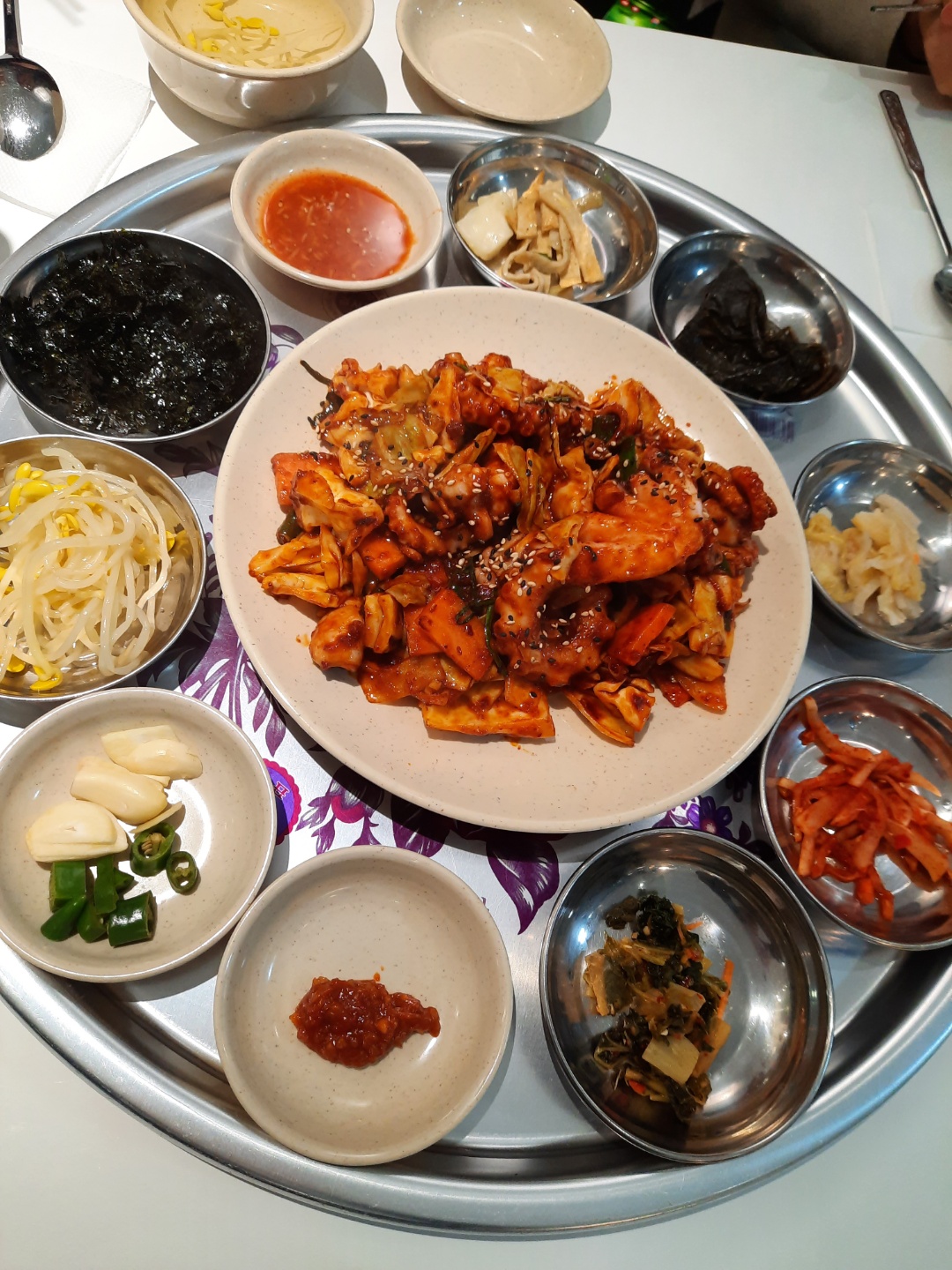 식당 이름과 연관성이 확실한 오봉으로 차려진 반찬과 직화낙지, 공기밥을 한번 주문하면 그 이후부터는 셀프로 더 퍼먹어도 돼더라고요. 친구는 2그릇을 먹었다는~~, 반찬도 셀프 추가가 가능했었던 듯하네요.