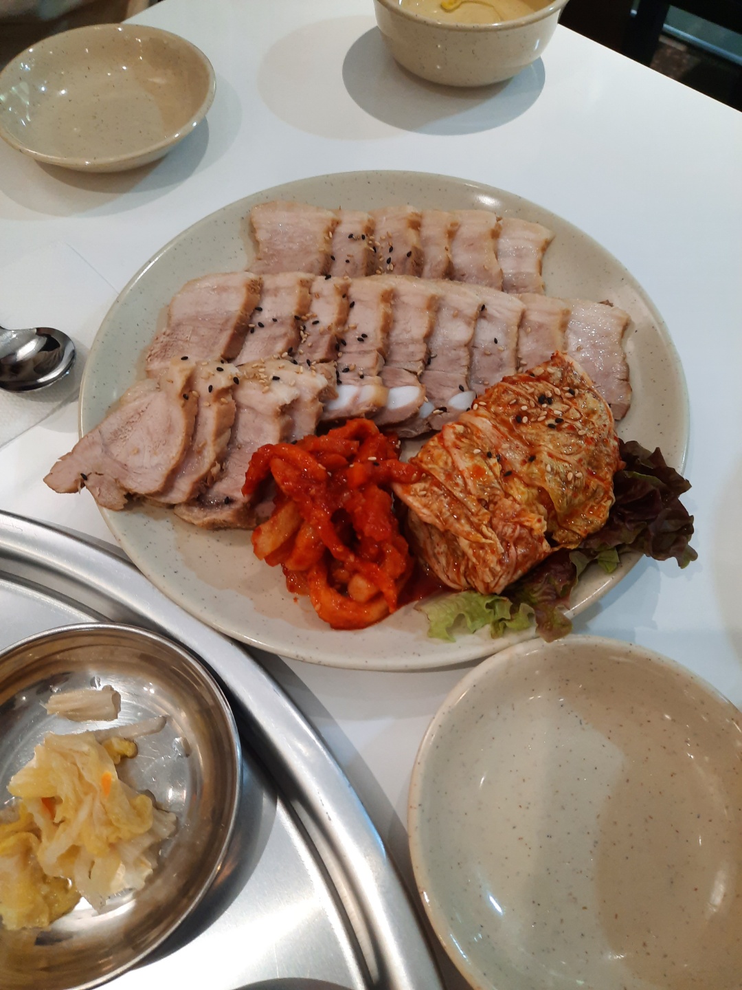 오돌오돌 뼈가 이쁘게 박힌 보쌈이 나왔습니다. 3명이서 먹기에 적지도 많지도 않은 양으로 나왔네요. 사진에는 안보이지만 상추와 배추속이 같이 나왔는데 그것에 싸먹으니까 너무 맛있더라고요. 담백하고 부드럽게 삶아졌더라고요. 아주 만족하면서 먹었습니다.