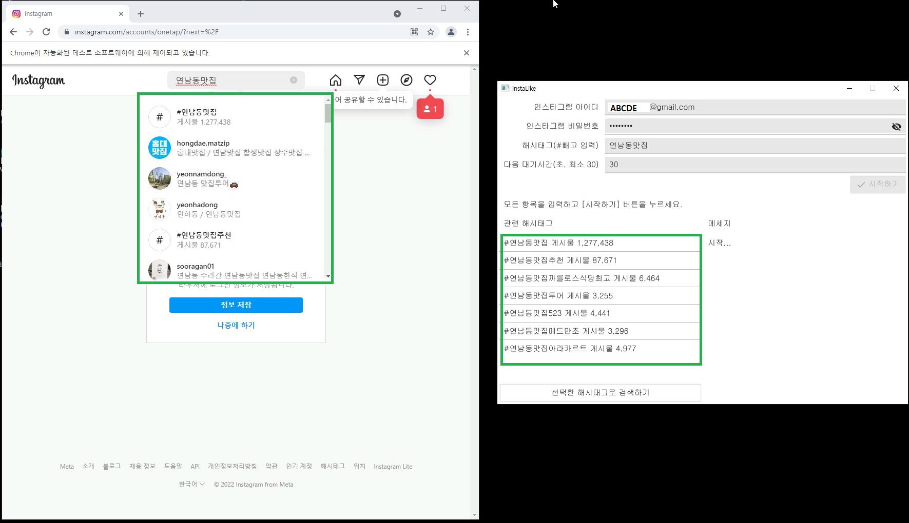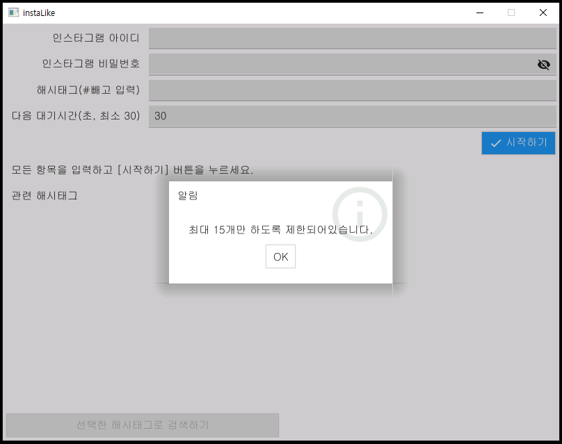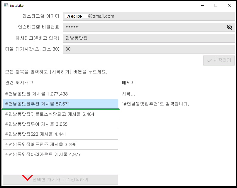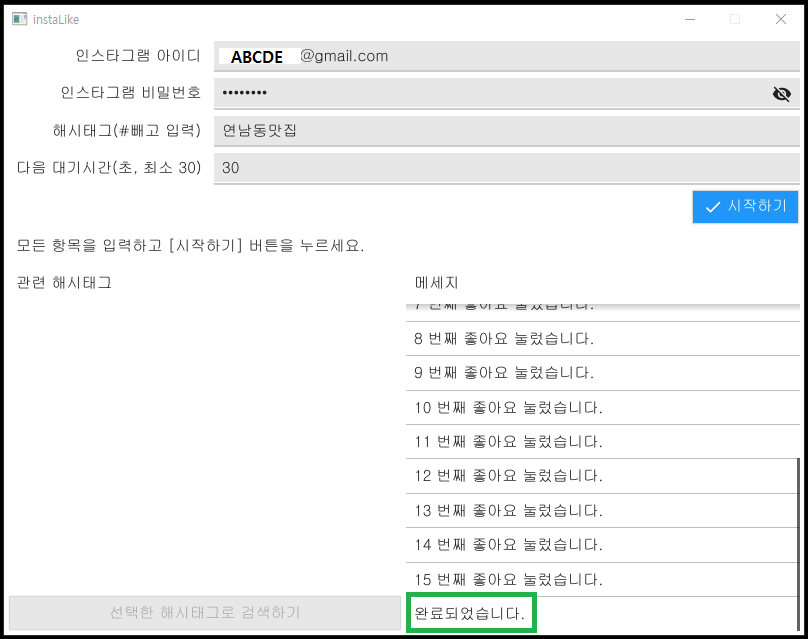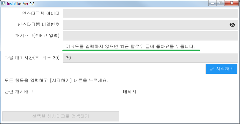 인스타라이크 프로그램 해시태그 입력란에 키워드를 입력하지 않으면 내가 팔로우한 친구의 게시글에 좋아요를 자동으로 클릭합니다.