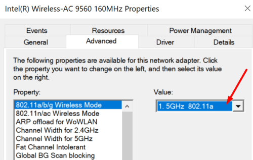 또한 무선 설정을 사용하고 다른 속성 및 값 설정으로 전환 할 수도 있습니다. 일부 사용자는 모든 설정을 5Ghz로 전환하여이 문제를 해결했습니다.