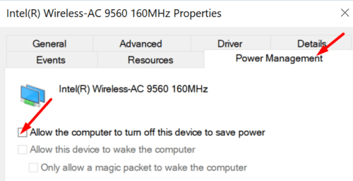 그런 다음 전원 관리를 클릭하십시오 . 그런 다음 Windows 10에서 전원을 절약하기 위해 무선 어댑터를 끌 수있는 옵션을 비활성화합니다.