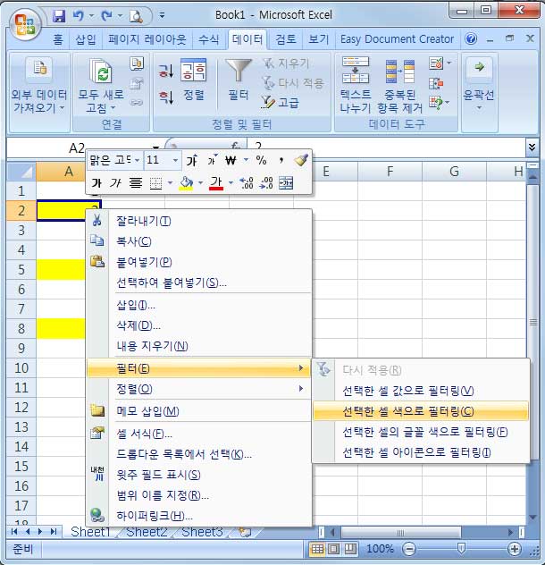 2. 색이 입혀진 데이터 셀에 마우스 우측 클릭 - 선택한 셀 색으로 필터링을 클릭