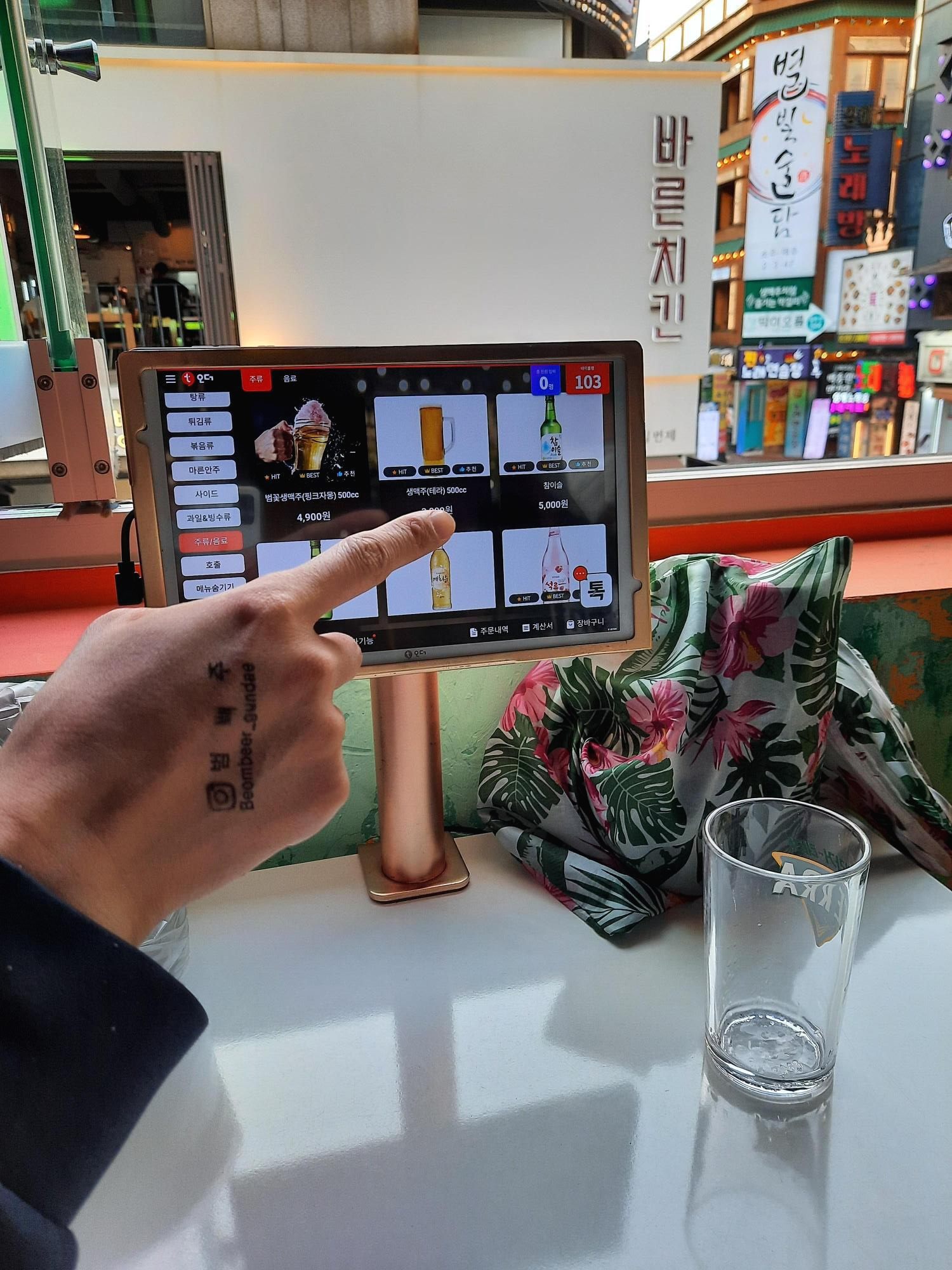 범맥주에서 주문은 촌스럽게 직원을 부르지 않습니다. 뭐 새로운 건 아니지만 터치패드로 모든 주문이 가능하니까요.