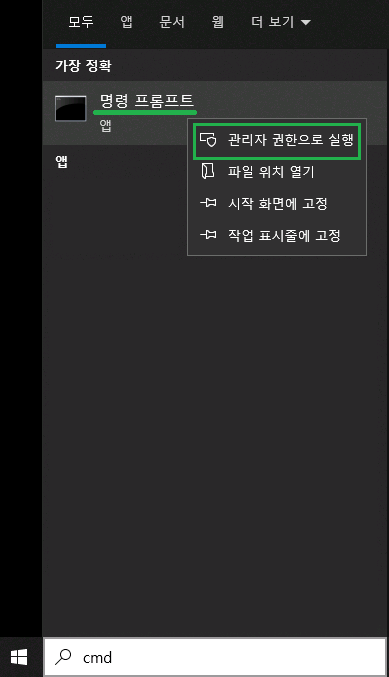 1. 작업 표시줄 돋보기 - CMD 입력 - 명령 프롬프트 관리자 권한으로 실행