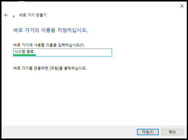 3. 바로 가기 버튼 이름 '시스템 종료'를 입력합니다.