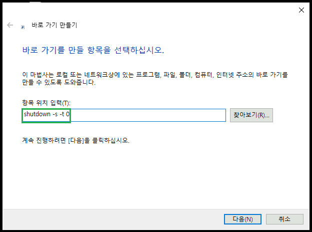 2. 바로 가기 만들기 'shutdown -s -t 0' 입력 후 다음 클릭