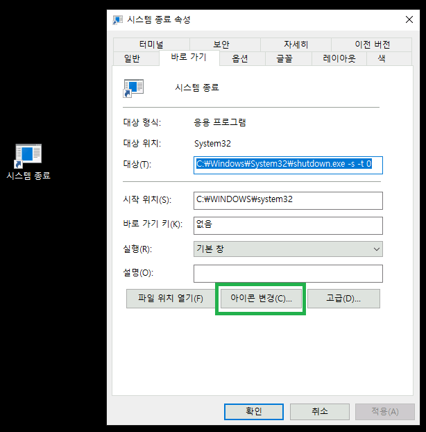 2. 시스템 종료 속성 - 아이콘 변경(C) 선택