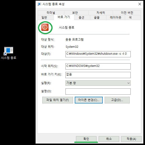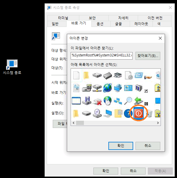 이대로 사용을 해도 되지만 아이콘 모양이 이쁘지 않네요. 시스템 종료에 맞는 아이콘을 만들어 줍시다.