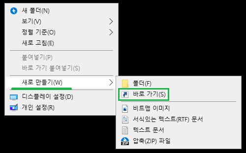 1. 바탕화면 빈 공간에 마우스 우측 클릭 - 새로 만들기(W) - 바로가기(S) 클릭