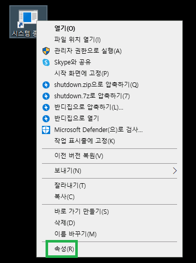 1. '시스템 종료' 버튼에서 마우스 우측 클릭 - 속성 선택