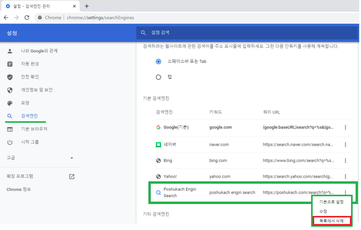 구글 크롬 검색엔진이 poshukach.com으로 고정되는 문제 해결 방법