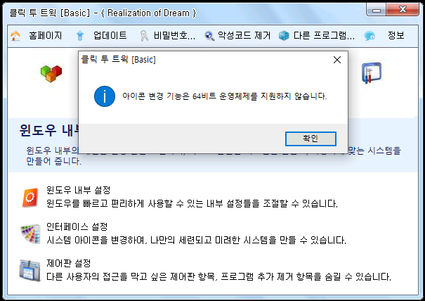 주의 3. 클릭 투 트윅은 2013년도에 개발이 중지가 되었기 때문에 64비트 운영체제는 지원을 하지 않고 있습니다.